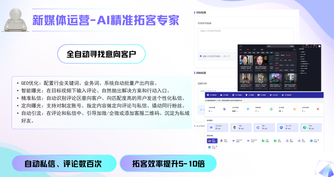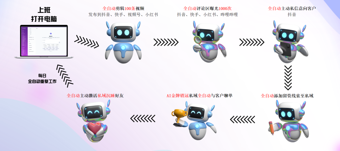 而且它能自动去抖音、快手、小红书、视频号这些平台,帮你找潜在客户,还能自动跟客户聊天,慢慢引导客户加你的私域,不用你一个个去私信、去沟通,省了太多口舌。