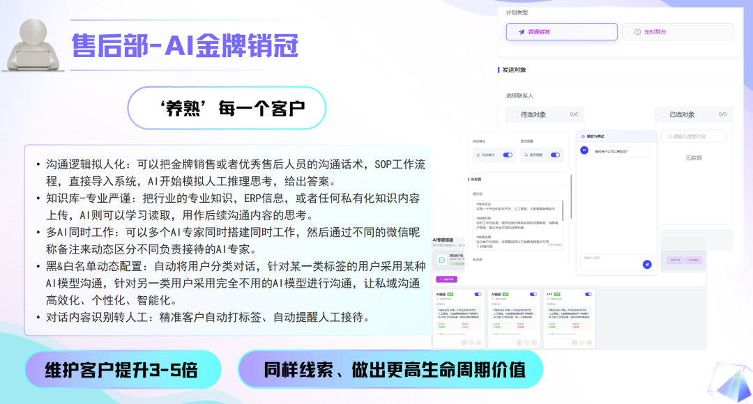 客户有售后问题,不用你一个个耐心解释,这个AI会自己学习你的业务资料、运营流程,然后自动跟客户沟通,帮你处理那些复杂的售后问题,维护客户的效率比人工快3-5倍,还不容易出错,省得你被售后琐事缠得脱不开身。